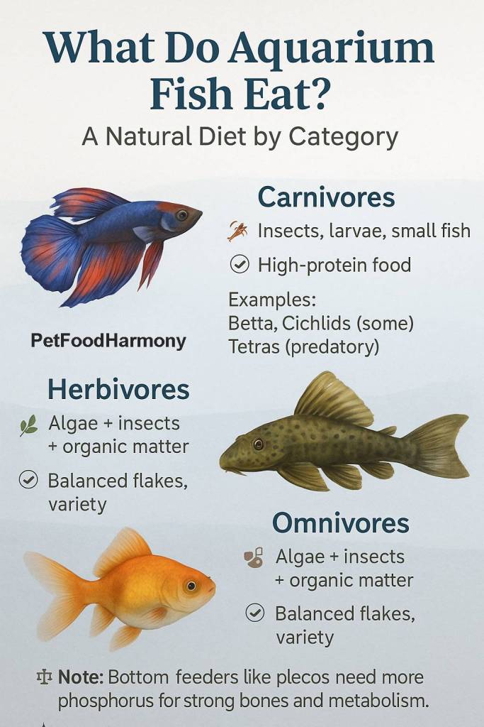 In the wild, fish eat according to their habitat, digestive systems, and ecological roles. Most aquarium species fall into three general feeding categories:
