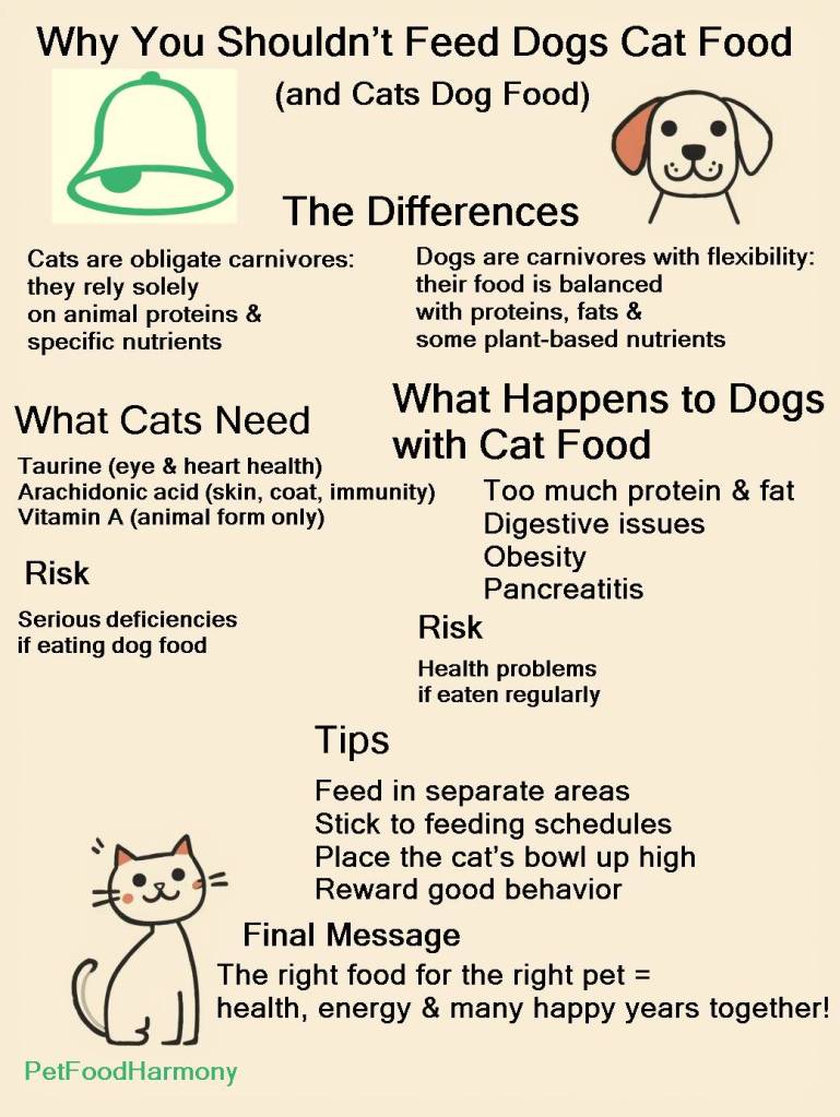Cats need nutrients like taurine that aren’t in dog food. If they eat dog food regularly, they risk serious deficiencies.