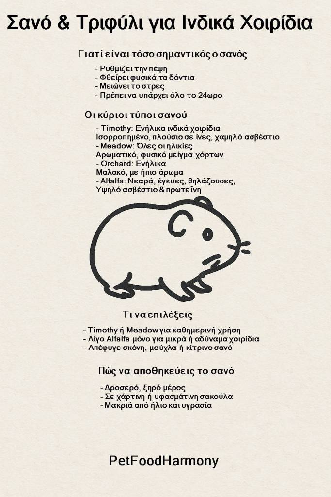 Το καλύτερο σανό για καθημερινή χρήση είναι το Timothy hay ή το Meadow hay. Είναι πλούσια σε ίνες, έχουν χαμηλό ασβέστιο και πρωτεΐνη, και βοηθούν στην πέψη και τη φθορά των δοντιών. Για ενήλικα ινδικά χοιρίδια, αυτά τα δύο είναι οι πιο ασφαλείς επιλογές.