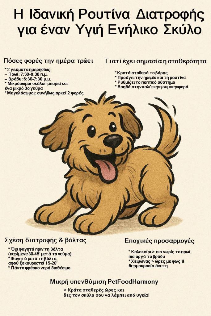 Επιπλέον, γνωρίζοντας τις ώρες που τρώει, μπορείς να προγραμματίσεις καλύτερα τις βόλτες και τις εξόδους σου — αφού ξέρεις πότε περίπου θα χρειαστεί να κάνει τις ανάγκες του.