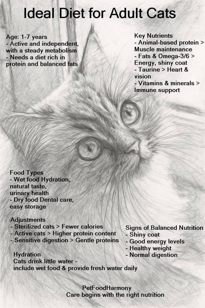 Adult cats (1–7 years old) require high-quality animal protein, sufficient fatty acids, and a balanced mix of vitamins and minerals.