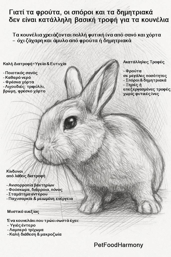 Αν όμως αρχίσουμε να δίνουμε στα κουνελάκια πολλούς σπόρους, δημητριακά ή φρούτα, τότε η ισορροπία αυτή χαλάει. Οι τροφές αυτές είναι πλούσιες σε ζάχαρη και άμυλο, τα οποία δεν μπορεί να διαχειριστεί σωστά ο οργανισμός τους.