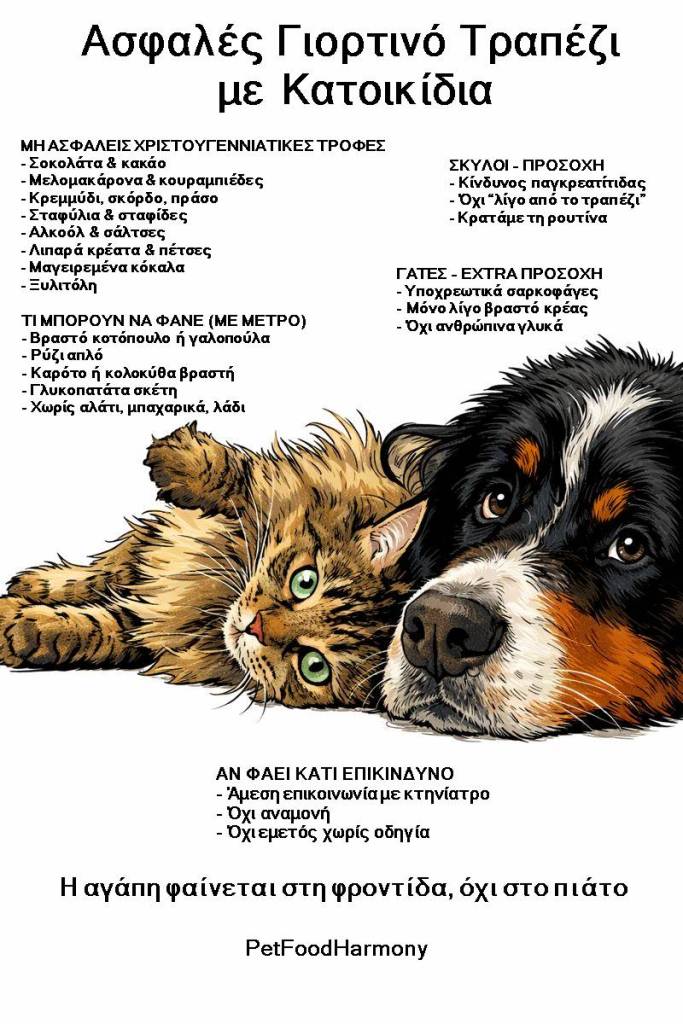 Η αγάπη δεν μετριέται σε μπουκιές από το τραπέζι, αλλά στη φροντίδα και τη γνώση. Ένα ασφαλές γιορτινό τραπέζι με κατοικίδια σημαίνει ήρεμες, χαρούμενες γιορτές για όλη την οικογένεια.