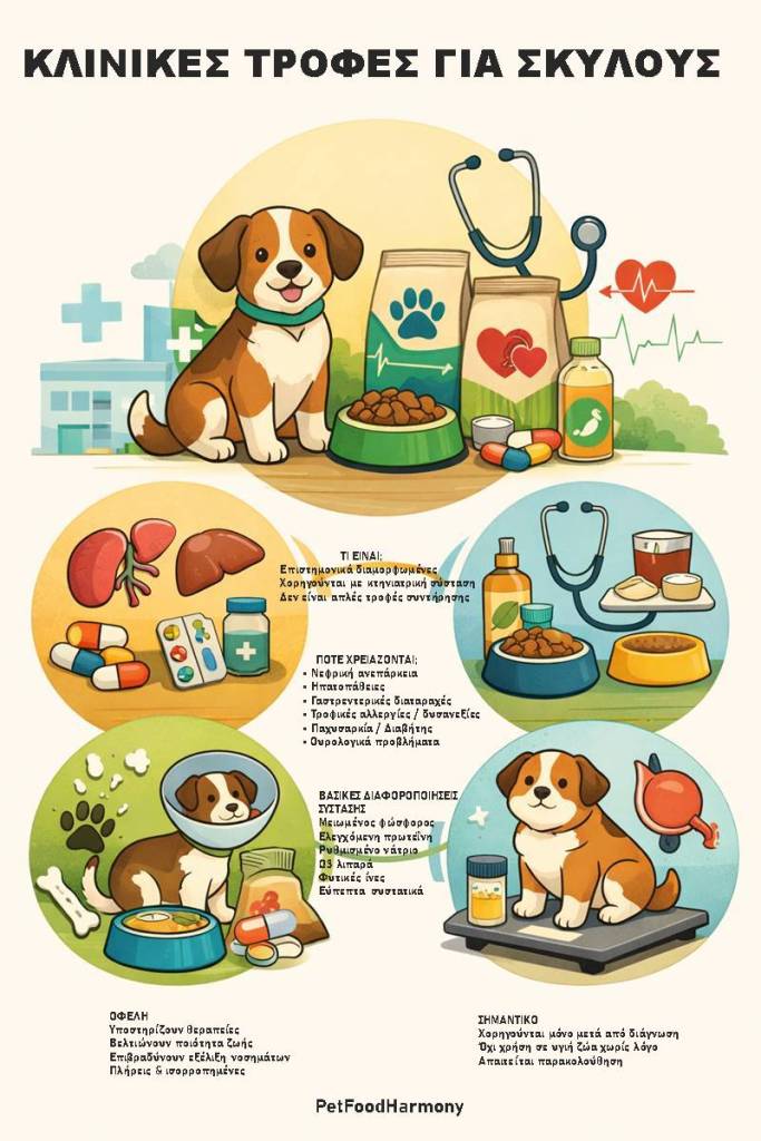 Οι κλινικές τροφές είναι πλήρεις και ισορροπημένες συνταγές, διαμορφωμένες βάσει επιστημονικών δεδομένων, ώστε να υποστηρίζουν τον οργανισμό του σκύλου όταν αντιμετωπίζει κάποιο πρόβλημα υγείας.