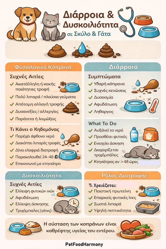 Η υγεία του πεπτικού συστήματος αποτελεί έναν από τους σημαντικότερους δείκτες ευεξίας για τον σκύλο και τη γάτα μας. Η σύσταση, η συχνότητα και ακόμη και η οσμή των κοπράνων μπορούν να μας δώσουν πολύτιμες πληροφορίες για το τι συμβαίνει στον οργανισμό τους.